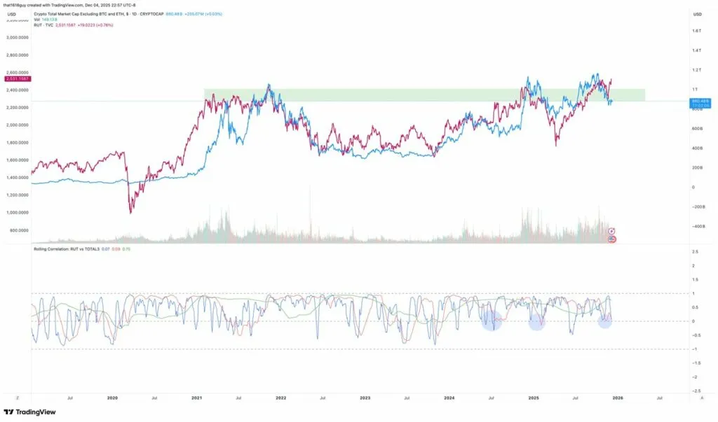 My correlation work shows a consistent and meaningful relationship between TOTAL3 and RUT across multiple time horizons (365, 90, 30) and that relationship matters, here’s why: