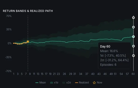 Most C regimes that are going to fail do so early. The ones that survive the initial window tend to run. Mean forward return by Day 60 is roughly +17%. We’re still in the fragile period, but the speed at which this regime reached durability suggests it belongs to the latter group, not the former. If it holds, the asymmetry from here gets interesting. If it doesn’t… we’ll know soon enough.
