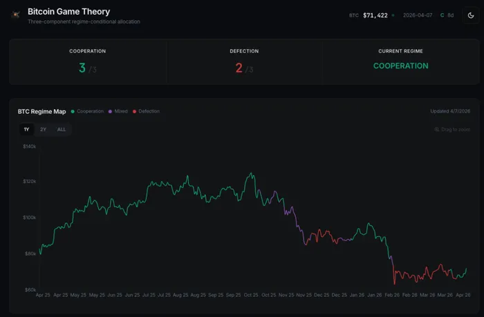 The BTC Game Theory model flipped into a fresh Cooperation regime on March 31. By Day 2, CPS had already cleared the 0.57 durability baseline, something that typically takes weeks and has never happened this early across 34 episodes. As of Day 8, CPS is 0.7411 and accelerating. Cooperation inputs are 3/3 while 2 of 3 defection signals remain active, meaning the cooperation side is dominant but the model is not reading all-clear. That context matters: this Cooperation regime is forming under pressure and not in a vacuum.