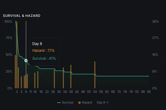 At Day 8, the hazard rate is 7.1% and falling, CPS is at 0.74 and accelerating and the cooperation side of the model is fully lit. The 2 active defection signals are worth watching but have not been enough to slow the CPS trajectory so far. The next milestone is Day 20, which marks the end of the Formation Phase and the point where conditional persistence odds improve materially.
