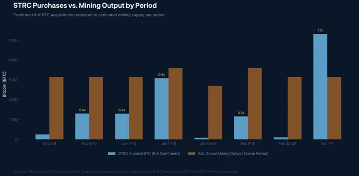 If even a small fraction rotates into STRC, the downstream effect on Bitcoin demand is disproportionate. Daily mining produces ~$30 to $35 million in new coins. In the Mar 1-7 filing period alone, STRC funded 5,315 BTC, equivalent to 1.7x total mining output for the same period.