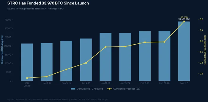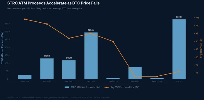 In January, STRC contributed $119 million toward BTC purchases. By the first week of March, that figure hit $377 million in a single week, roughly a third of Strategy’s $1.28 billion in total BTC purchases for that period.
