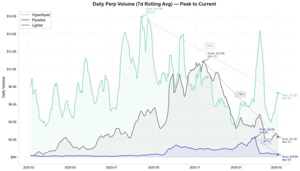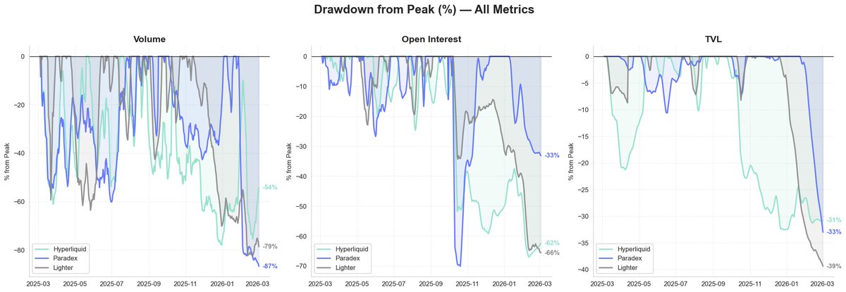 The end result is a 30-90% drawdown from their peak across metrics which is roughly in line with the two major onchain perp DEXs. So while the headline might say “Paradex volumes are down -87%”, net net, not as bad across various metrics.