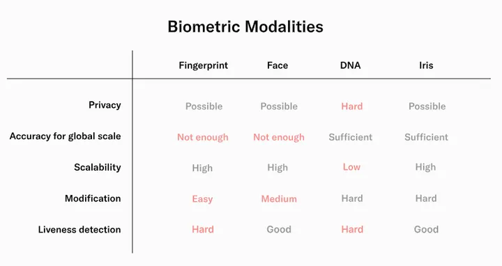 The entropy of the human iris makes it the most accurate biometric modality to use at a global scale. Consider all the times you told a friend that they “look like X person.” Now, consider the small fraction of total humans you have ever seen. As the inclusion set grows, it becomes more difficult to differentiate every additional person. There’s a lot of doppelgängers out there! So, you need a biometric with enough randomness to prevent false matches. Irises are the best option that also happen to be difficult to modify and privacy-preserving.