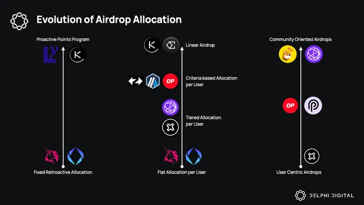 The UNI airdrop started with a flat reward (400 tokens) for each swapper. Then, we saw tiered airdrops, where protocols started to make a general tiered distinction between users, and the airdropped amount within each tier remained constant (Jito). The Optimism team popularized multiple criterion-based airdrops, with qualifying users receiving incremental tokens for each criterion they satisfy. This methodology was utilized by many protocols, including Arbitrum and zkSy