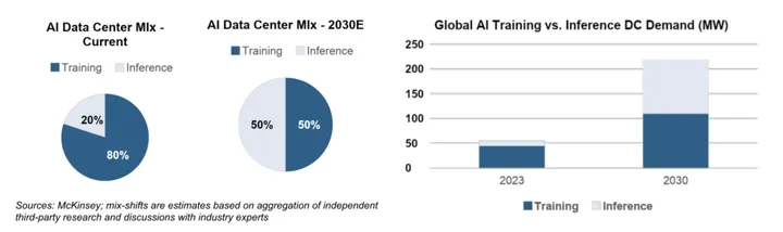 - While the percentage mix of all AI-related compute will shift from training towards inference as AI applications are put into production, the dollar value spent on training will continue to grow. Growth in the overall pie will offset training becoming a smaller piece of that pie. See below.