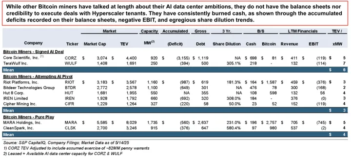 - Bitcoin miners without signed deals are playing catch-up and facing an uphill battle. Traditional hyperscalers are extremely unlikely to become the first ever tenants for these miners, while Neoclouds will likely prefer to lease space from the players who have established themselves in the data center operations space (i.e. Galaxy, CORZ, and WULF).