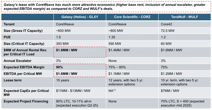 - Embedded Expansion Capacity: In addition to the ~600MW (3) to be leased to CoreWeave, Galaxy has 200MW (3) of approved gross IT capacity, and an additional 1.7GW under load study. Galaxy expects approval for an additional 800MW (3) in the coming months. This embedded expansion capacity far exceeds that of the Bitcoin miners who have successfully signed initial AI leasing deals (see pg. 8).