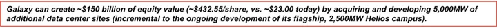 - Ascribes zero value to Galaxy’s other operating businesses for conservatism; $6MM TEV divided by 1,600MW of expected approved power by FY26E
