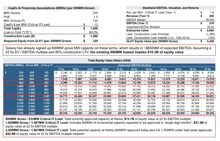 Galaxy’s shares should re-rate as the Company continues to execute on transforming Helios into an AI data center platform. Galaxy’s executed lease (~600MW (3)) with CoreWeave represents less than 25% of the total potential power capacity at Helios (2,500MW). We expect Galaxy to execute leases for the 1,000MW(5) of additional expected available power at Helios within the next year, which would result in 1,600MW (3) of capacity on lease, and $1.7B of EBITDA(6). We believe shares are significantly undervalued, as $1.7B of EBITDA represents our view of the floor amount of EBITDA to be contracted by FYE 2026. Traditional data center REITs’ valuations at 25x EBITDA imply ~$43B of enterprise value at $1.7B of EBITDA, and ~$32B of equity value (reflecting the ~$11B of debt incurred to finance build-out) for Helios. Galaxy has clear visibility into scaling significantly beyond this amount, given Helios’s total potential capacity of 2,500MW and the Company’s intention to acquire and develop additional data center sites. Finally, Galaxy is uplisting from the Toronto Stock Exchange to the NASDAQ tomorrow (May 16, 2025), which serves as another positive catalyst for its shares.