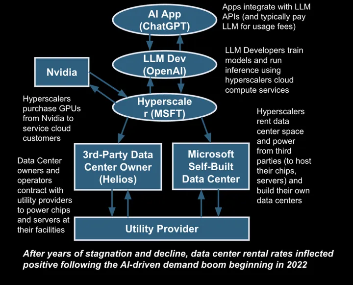 The Hyperscalers (Amazon, Microsoft, Google, Meta, Oracle, and CoreWeave) are public cloud service providers and megacap internet companies who provide cloud computing services for external clients and for use in-house. For example, Microsoft’s Azure provides OpenAI with compute capacity for OpenAI’s models, while also powering Microsoft’s own Copilot AI applications. The hyperscalers both construct their own data centers with in-house development teams as well as lease data center space from third-party providers.