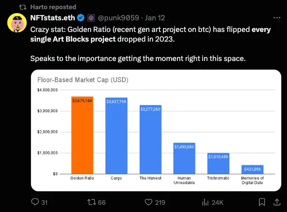 Another challenge that Bitcoin art faces: it is fragmented today, with no platform or community having convincing emerged as the “Art Blocks” for Ordinals. This makes it harder for collectors to discover art they like.