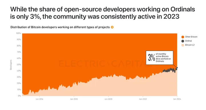 While the majority of Bitcoin developers focus on the main Bitcoin network and Bitcoin Layer 2 solutions, the Ordinals side saw consistent activity throughout 2023. Looking ahead to 2024 and beyond, we anticipate this momentum to persist and gradually expand. The Ordinals developer scene is passionate.