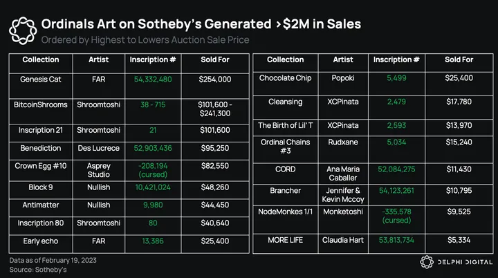 Following the initial success, Sotheby’s auctioned off an array of artworks and rare sats, all of which were eagerly snapped up, often fetching prices well above their estimated values. The cumulative sales amounted to $2.4M, signaling a robust appetite for Ordinals art.
