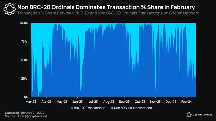 While BRC-20s still make up a chunk of Bitcoin transactions, non-BRC-20 Ordinals are also doing well and have a larger market share than most of last year. However, note that this includes newer experimental token standards like BRC-420, ARC-20, and bitRC-20. It is still too early to tell which token standards will stick over time.