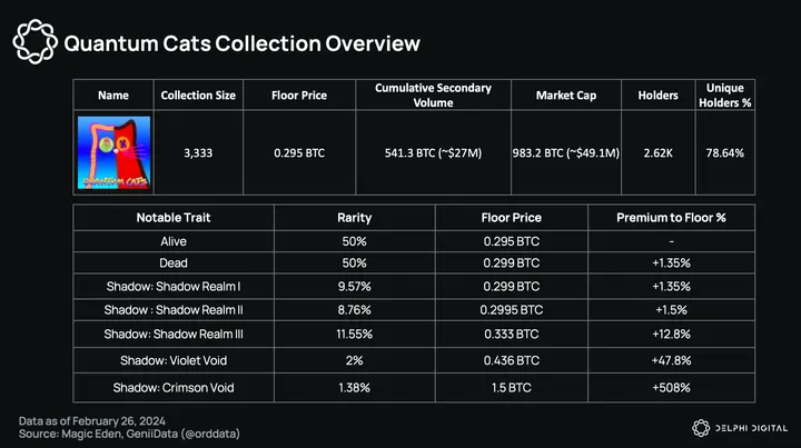 The collection is split 50/50 between two distinctive groups — “Dead” and “Alive” cats. The collection was initially minted for 0.1 BTC per NFT on February 7, raising a primary revenue of 300 BTC (~$13.3M) for the Taproot Wizards team.