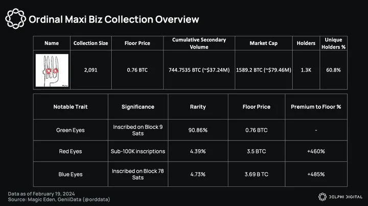 Notably, during Super Bowl 2024, over 3000 new OMBs were inscribed onto Bitcoin with the orange eyes trait, with some inscriptions occurring on some of the oldest Bitcoin sats. These have not yet been made available for sale, and it could pay to watch closely for announcements around this.