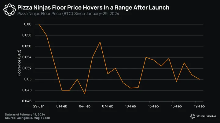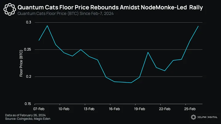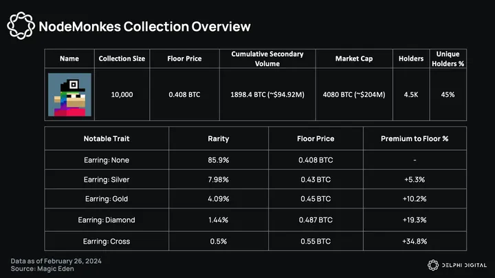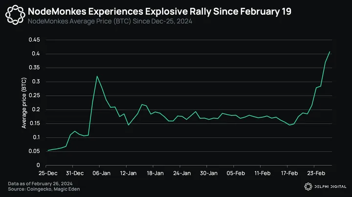 NodeMonkes saw frenzied trading activity after launch, with average prices peaking at 0.32 BTC on January 5, with a peak trading volume of 594 BTC (~$26.8M) during the first week of January. After a brief cool-off period, NodeMonkes experienced another run-up on February 19, which saw the collection rally from 0.15 BTC to 0.4 BTC on February 26. This was catalyzed by the project’s team mention of more Ordinals airdrops going to NodeMonke holders, and Twitter mentions from notable KOLs such as The Crypto Dog, Kevin Wu, and hentai avenger.