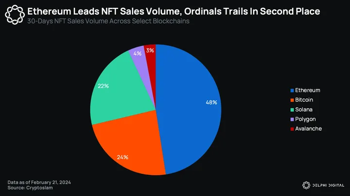 As far as NFT trading volumes are concerned, Bitcoin Ordinals is in a comfortable spot in 2nd place among NFT ecosystems with a 24% volume share. This is slightly more than Solana, which trails in 3rd place with a 22% volume share over the past month.