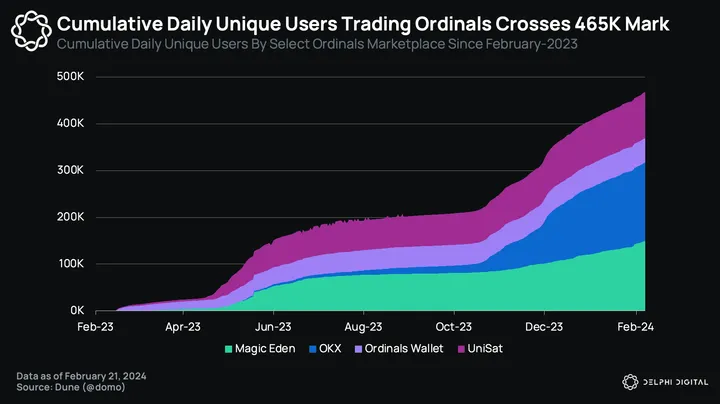Presently, OKX maintains its position as the market leader with 53.5% of the trading volume, while Magic Eden follows closely behind in second place with a volume share of 31.1%. OKX boasts the highest number of Ordinals users, with 166.5K cumulative users. Magic Eden trails closely behind, with 146.7K. At the time of writing, the number of cumulative Ordinals users reached its highest point at 468.3K.
