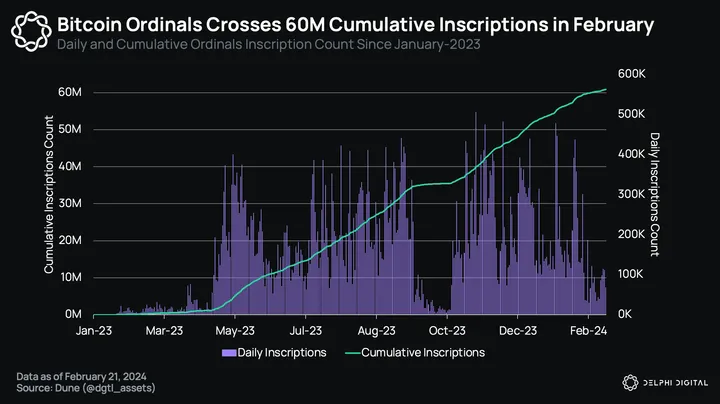 During the peak of Ordinals inscription activity in November to December last year, monthly fees paid to miners surged from 26.4 BTC in October 2023 to a staggering 2,095.8 BTC in December 2023, marking a remarkable 79x increase in fee revenue within two months. While the fervor may have subsided, Ordinals fees continue to climb steadily in February, albeit at a more moderate pace. Should this trend persist, it could help mitigate the issue of Bitcoin’s declining security budget.