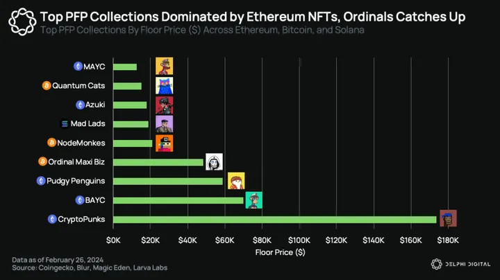 While the top PFP collections by floor price still consist mainly of Ethereum NFT collections like Punks and Bored Apes, Bitcoin Ordinals is catching up, with 3 Ordinals PFP collections (Quantum Cats, NodeMonkes, and OMBs) climbing into the top ranks.