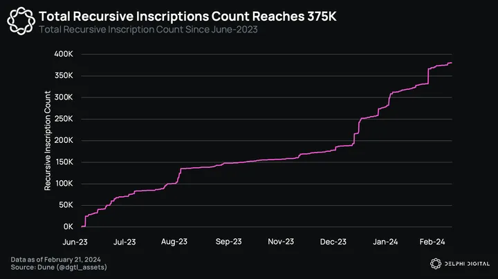 Since its inception in June 2023, recursive inscriptions have been slowly gaining momentum as builders start to learn and appreciate their benefits, mainly the ability to expand upon the 4MB data-capped constraints per Ordinals inscribed and allowing for greater interoperability and design space around Ordinals. As of February, there are already more than 375K recursive inscriptions on the Bitcoin network, and the momentum shows no signs of slowing down.