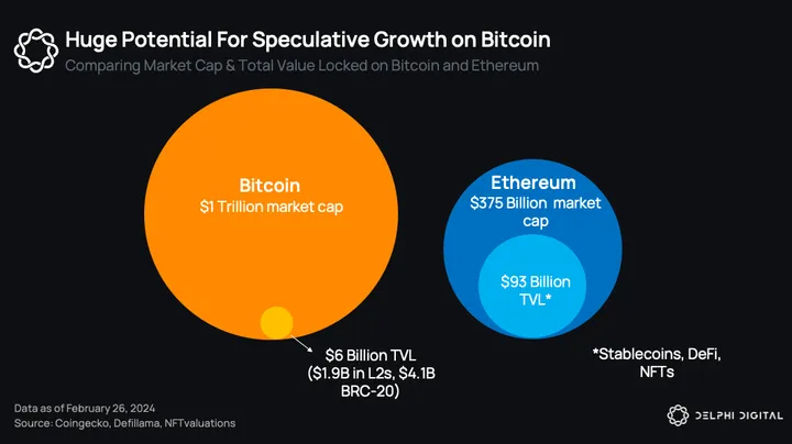 - Even a modest yet expanding portion of this capital represents a substantial sum. Despite having three times the market cap of ETH, Bitcoin’s locked value in L2s and BRC-20s (~$6B in total) remains a small fraction of Ethereum’s TVL (~$93B in stablecoins, DeFi & NFTs). This suggests significant growth potential.