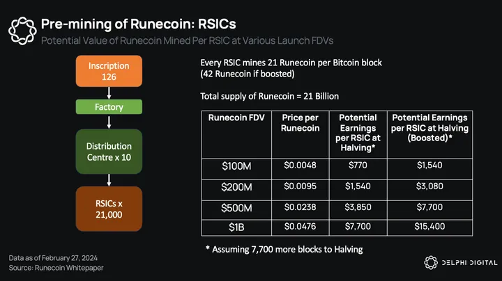 - Based on the current floor price of RSICs, there is an implied market cap of $160M for Runecoin at launch (21,000 * 323,400 / 4,950 * 21B = $160M)