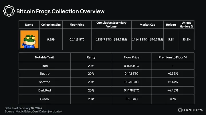What makes Bitcoin Frogs desirable? Frogs resonate deeply with crypto culture, drawing inspiration from the popularity of Pepe the Frog. The collection also holds significance as one of the earliest Ordinal PFP collections and the first to be minted via the Lightning Network. Bitcoin Frogs can be seen as one of the cultural faces of the early Ordinals ecosystem, a symbol for participants to signal their status as pioneers.