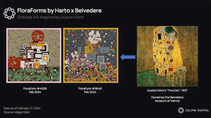 FloraForms is a 10K fully on-chain generative art collection by artist Harto and made in collaboration with the Belvedere Museum of Vienna. It draws inspiration from Gustav Klimt’s “The Kiss”, whose works have been said to also resemble generative art. It launched on 14 February for free (inscription fees only) and now sits at a floor price of 0.003 BTC ($150).