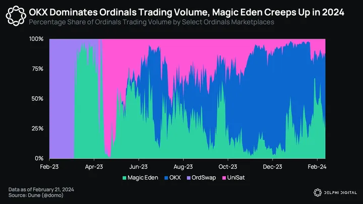 There is a noticeable oligopoly in Ordinals marketplaces, with both Magic Eden and OKX vying for market dominance throughout much of 2023. Magic Eden initially held an early advantage going into Q3 of last year but faced formidable competition from OKX starting in August. OKX eventually emerged as the frontrunner during the second wave of inscription mania from November to December 2023, securing 84% of the Ordinals trading volume market share during this period.