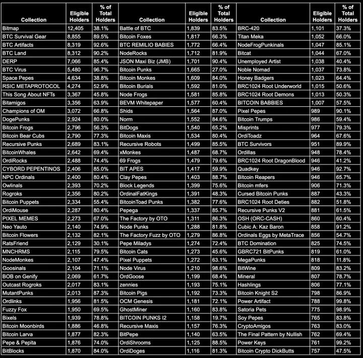 Runestone boasts the title of the largest Bitcoin airdrop, with eligibility requiring participants to hold at least three inscriptions at a block height of 826,600. With over 2000 collections and 113,376 addresses, Runestone promises a fair launch for all participants. The airdrop has no team allocation and is entirely funded by community donations. Users can track their wallet eligibility here.