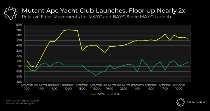- BAYC is a project with an extremely vibrant community and one of the most decentralized PFP communities. With the hype that has garnered and a fresh novelty factor, MAYC floor price outperformed BAYC and is up by nearly 2x since launch. Apes together very strong!