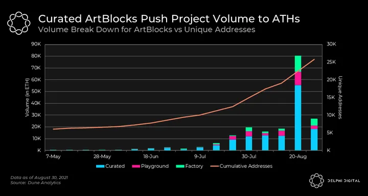 - While Curated drops remain the most attractive for collectors and speculators, Factory and Playground drops have been garnering more attention too. If you’re interested in learning more about Art Blocks, keep your eyes peeled for content dropping this week — exclusively for Delphi Digital Institutional subscribers. Subscribe now if you don’t want to miss it!