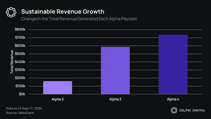 That said, MetaCene successfully scaled monetization to a monthly average revenue per user (ARPU) of $48 and a monthly average revenue per paying user (ARPPU) of $177 during alpha 3. These metrics have since normalized to $15 and $64, respectively, in the latest playtest but are still an estimated 3-5x higher than many of the leading Web2 incumbents. Stepping back, this equates to MetaCene generating a total of $737,295 in revenue within less than one month of the latest playtest going live, representing a 26% increase from alpha test 3 and a 356% increase from alpha test 2 – not accounting for any new monetization that has been added over time.