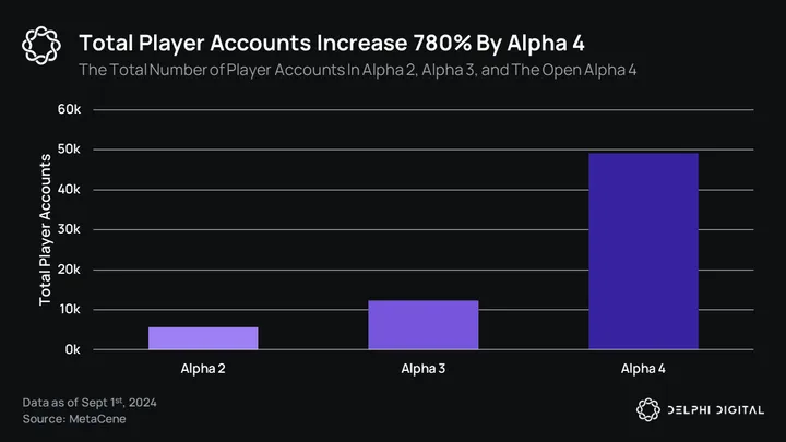 In terms of the total number of unique player accounts, MetaCenes reports an increase of almost 780% from Alpha 2 to the current open alpha, which sits at just under 50,000 accounts. This represents an average of 6.6k DAU, as tracked by MetaCene, and an average of 1.5k daily unique active wallets (DUAW), as reported by DappRadar.