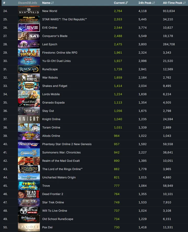 The current landscape of MMORPG is predominantly dominated by a relatively small number of decades-old IPs. The increasingly large development and marketing budgets needed to compete, combined with multi-year-long development cycles, make launching a new MMORPG a highly risky decision for a studio. For example, Amazon spent hundreds of millions on the development and launch of New World, only for it to suffer from hour-long queue times at launch and a current concurrent player count of <4k.