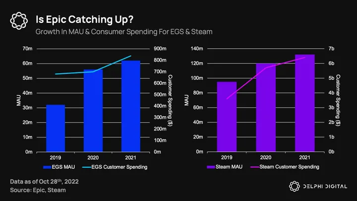 2020 was a year of growth for these two platforms, just in different ways. EGS saw monthly active users increase by 75% compared to Steam’s 26%. However, this could be due to the large number of free and exclusive games distributed by the platform, seeing as customer spending on Steam grew 58% compared to EGS’ measly 3% (although EGS did see spending increase 20% in 2021 compared to Steam’s 12%). So what are the key takeaways for Web3 builders?