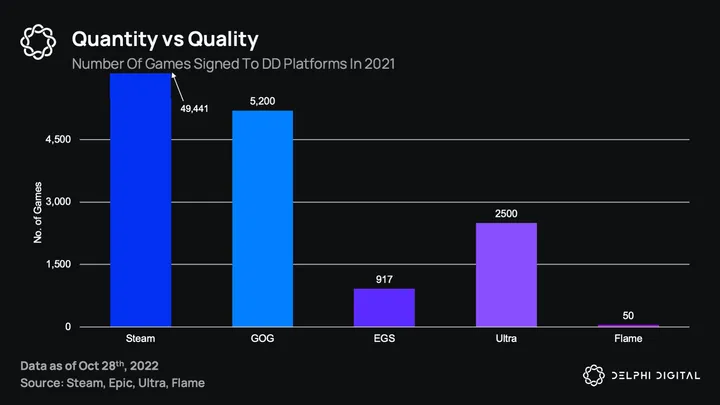 GOG has been praised for its more curated approach, and they still have more than double the games of the closest Web3 competitor. Because there isn’t enough choice in the current Web3 market, more importance will be placed on the number of total blockchain gaming users, with the upper hand potentially going to platforms that secure the most popular exclusive titles (like what Ultra is trying to do).