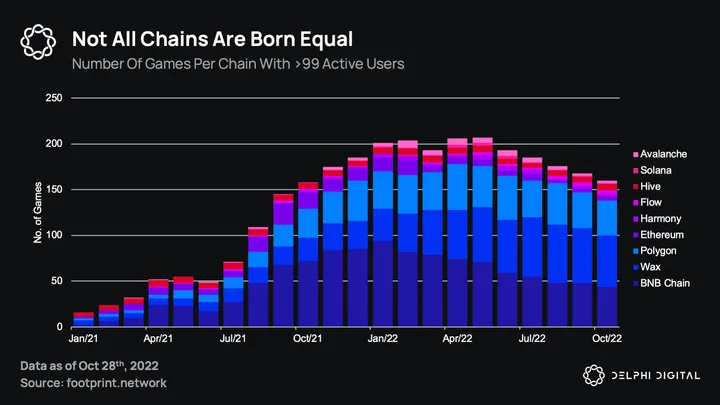 Interactions on Hive and WAX are dominated by three games: Splinterlands, Alien Worlds, and Farmers World, which slightly skew the chart. However, it is encouraging to see the “underdog” Solana slowly catching up to the more established gaming chains, BNB and Polygon, which both see many new games being deployed each month (see below).