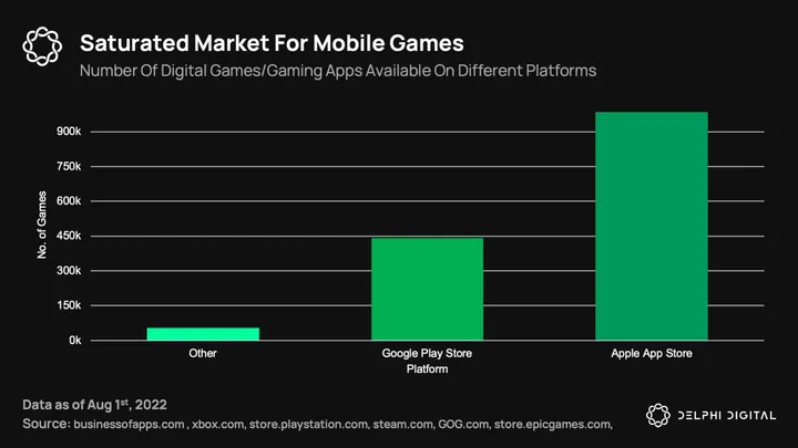 As seen in the chart below, the number of games available on both the App Store and Play Store amount to 96% of all available games on any other distribution channel. Both mobile platforms are highly saturated, leading to discoverability issues and increasing user acquisition and retention costs. That being said, Apple recently approved the sale/trading of NFTs within apps listed on its App Store, making this a promising option for Web3 teams looking to gain access to the ~1B iPhone users (provided they don’t mind bending the knee and succumbing to new guideline limitations).