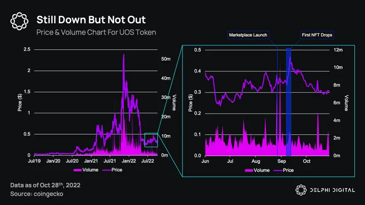 In the build-up to the marketplace’s launch on Aug. 29th, the price of UOS saw an initial increase of 21% followed by an additional pump of 46% during the release of the first few UNIQ NFT collections (purchasable only in UOS) from Sept. 7th-11th. This event also resulted in the highest levels of trading volume for UOS in the past 99 days.
