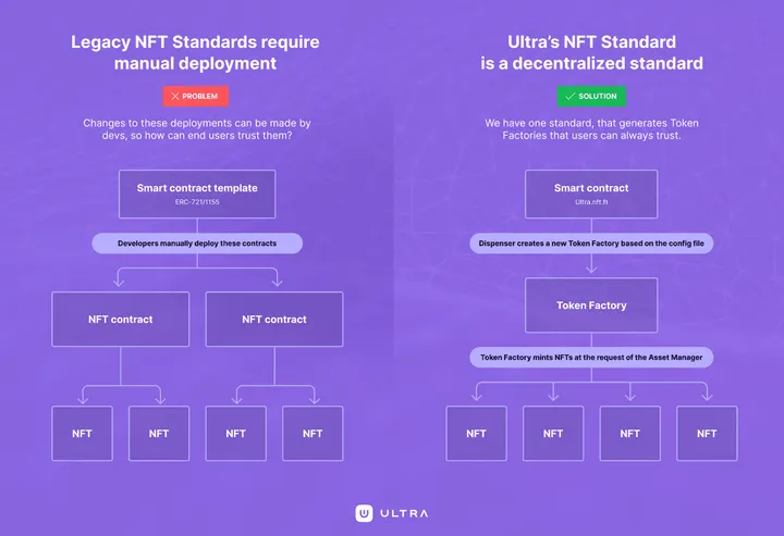 Asset creators follow the standards provided by Ultra to create a Token Factory (TF), and use a predefined series of parameters for collection size, royalties, etc. They can then assign themselves or a separate entity as the asset manager who executes the order to allow an NFT to be minted by an asset owner.