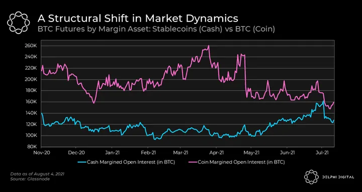 - The shift became even more visible in recent months as cash margined open interest soared in the aftermath of the May crash. At the same time, coin margined open interest has been trending downwards since Apr. 2021.
