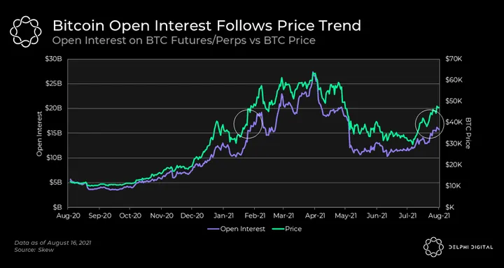 - A pattern you see with crypto markets that differs from other markets is how open interest tracks price. For the most part, this is because the vast majority of BTC open interest accounts for traders who are trying to increase their long exposure and delta-neutral players taking advantage of basis/funding.