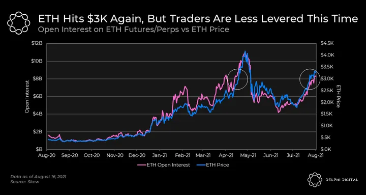 - ETH’s structure looks fairly similar to BTC’s, but the difference between price and open interest growth is a little wider. ETH closed yesterday at $3310 per coin with $8.25 bn in open interest. The first time ETH hit $3300, in May 2021, open interest was just over $10 bn, and trading volume was much, much higher.