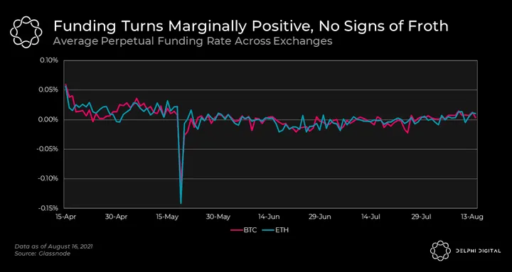 - Another sign the market isn’t being propped up by leverage comes from funding data. When funding is positive, it means the perp is trading higher than the spot index for said asset. When funding is negative, the perp is trading at a discount to the spot index. Positive funding implies more buyers than sellers, and negative funding implies the opposite.