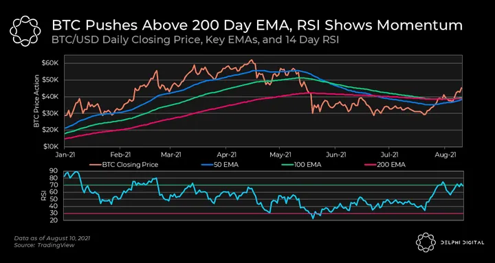 BTC secured a daily close above its 200 day exponential moving average (EMA) for the first time since May, indicating that it’s firmly in an uptrend. The Relative Strength Index, which measures market momentum, has also turned positive in recent weeks.