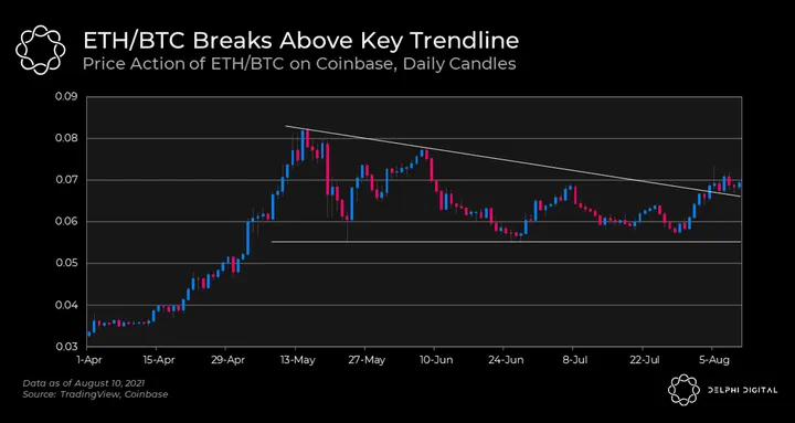 - The fake out possibility exists in this scenario too. A true sign of trend confirmation would be consolidation above the trend line or an immediate continuation of ETH/BTC’s rally.